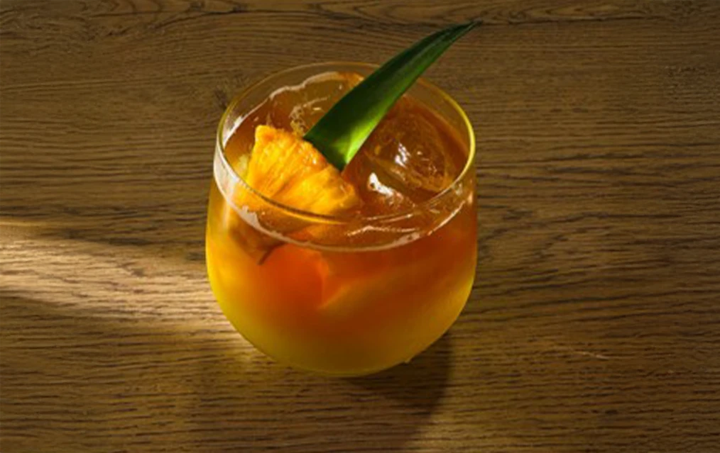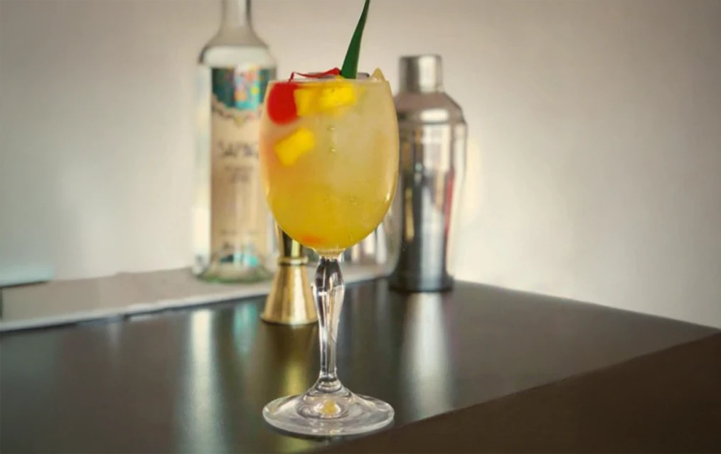 * Colocar dos o tres cubos de hielo en una copa. Incorporar los ingredientes. Remover suavemente. Decorar con trozos de piña y una cereza.